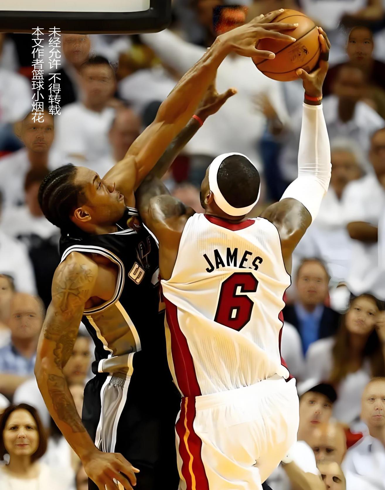 护框型中锋走下历史舞台之后,协防型护框手又上来了,代表性的人物,比如肖恩-马里昂,卡哇伊-伦纳德,安德烈-伊戈达拉,凯文-杜兰特,包括雄鹿的字母,这帮人的特点就是身高尺寸足够,既能蹦又能跳,胳膊还老长,他们不跟老詹硬碰硬,老詹想靠力量往里推,那就让他推,他们抓的就是老詹出手的那一下。